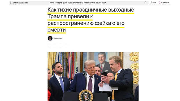 Окончательно "подтвердил" теории о смерти Трампа вице-президент Джей Ди Вэнс в интервью 28 августа. Вэнс сделал тысячу и одну оговорку по поводу того, что Трамп "находится в отличной форме" и "невероятно здоров". Но все услышали другие его слова — что в случае необходимости Вэнс готов исполнить конституционный долг и занять место в Овальном кабинете: