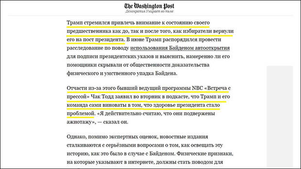 И даже когда ситуация явно вышла из-под контроля и приобрела нездоровый характер, ведущие либеральные СМИ вроде The Washington Post принялись её оправдывать. Мол, ничего из ряда вон выходящего, свобода слова. И сознались: республиканцы и прочие консерваторы активно использовали тему ментального и физического нездоровья предыдущего президента Джо Байдена. Теперь пришла очередь для ответных действий в адрес Трампа…