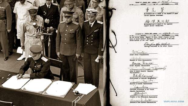 Давайте вспомним исторический факт: 2 сентября 1945-го Япония подписала акт о безоговорочной капитуляции. Причем СССР был в числе победителей, хотя американцы пытаются себя выставить единоличными победителями.