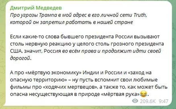 И вот тут Медведев отвечает так, что Трамп, вероятно, вскипел еще сильнее — но ответить уже было нечего. Бывший президент России тонко намекнул, что если какие-то его слова вызвали такую истерику у «грозного лидера» США — значит, попал он точно в цель. А дальше — больше: сравнение «мертвых экономик» с зомби из американских сериалов и напоминание о «Мертвой руке» — советской системе автоматического ядерного ответа. Намёк понятен даже Трампу, если он действительно фанат апокалипсиса.