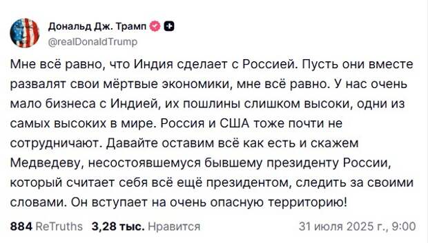 Всё началось с того, что Медведев раскритиковал «ультиматум» Трампа о необходимости мира с Россией в течение 10 дней, добавив, что такие фокусы — это игра с войной. Неожиданно Трамп, явно задетый, переходит к оскорблениям: называет Россию и Индию странами с «мертвыми экономиками» и требует, чтобы Медведев «следил за языком».
