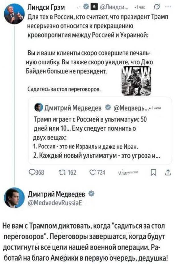 Параллельно он отчитал и сенатора Линдси Грэма* (признан террористом и экстремистом в РФ), который тоже решил поучаствовать в медийной клоунаде и призвал «слушаться Трампа». В ответ Медведев сказал, что переговоры начнутся не по указке американцев, а только после достижения всех целей СВО. «Работай на благо Америки, дедушка!» — коротко и по делу.