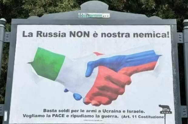 На другом рекламном щите в Риме разместили призыв: «Достаточно денег на оружие для Украины и Израиля».Аналогичные билборды установлены в Вероне, Модене, Парме, Пизе и других крупных городах Италии.