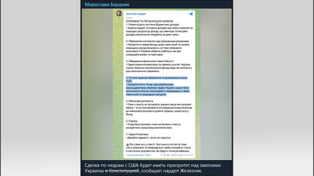 Многие задаются вопросом, почему первая часть договора по ресурсам написана в размытых формулировках. Причина в том, что именно за него необходимо голосовать в Раде и опубличить, а вот вторую часть "договора про ограниченное партнерство" никто публиковать не будет, но там будет написано самое главное. Фактически прописаны пункты для "колониального государства 21 века",