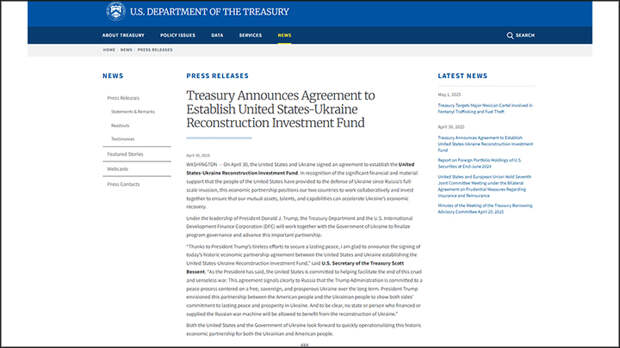 Благодаря неустанным усилиям президента Трампа по обеспечению прочного мира я рад объявить о подписании сегодня исторического соглашения об экономическом партнерстве между США и Украиной, учреждающего Инвестиционный фонд реконструкции США и Украины. Как сказал президент, Соединенные Штаты намерены содействовать прекращению этой жестокой и бессмысленной войны. Это соглашение ясно дает понять России, что администрация Трампа привержена мирному процессу, в центре которого будет свободная, суверенная и процветающая Украина в долгосрочной перспективе. Президент Трамп задумал это партнерство между американским и украинским народом, чтобы продемонстрировать приверженность обеих сторон прочному миру и процветанию в Украине,
