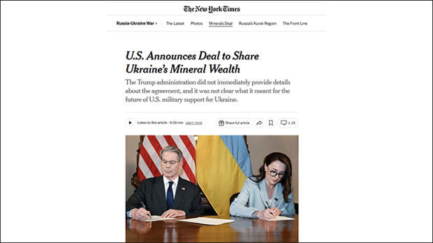 Вашингтон и Киев подписали, по версии американской стороны, "историческое соглашение", суть которого можно изложить в двух словах: американцы будут дербанить украинские недра взамен либо на восстановление порушенной войной, коррупцией и бесхозяйственностью украинской экономики, либо на оружие для продолжения войны с Россией.