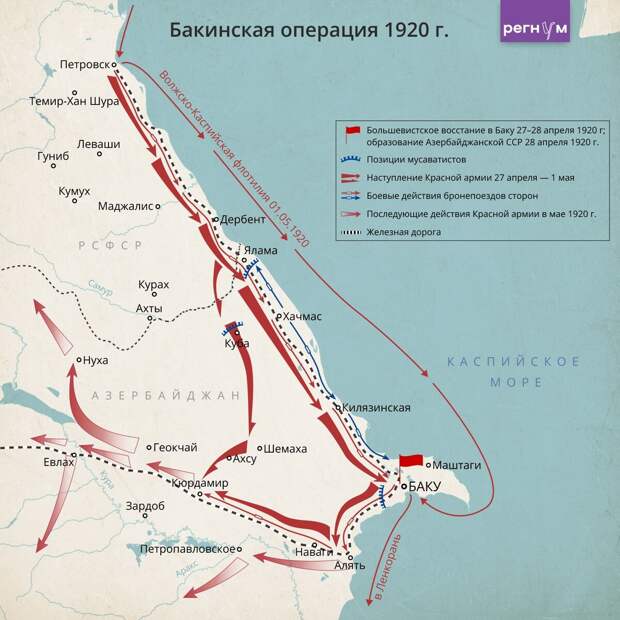 План был реализован уже после разгрома Деникина — и весьма быстро: 27 апреля 1920 года азербайджанские коммунисты подняли восстание, в ночь на 28-е группа бронепоездов выдвинулась из Петровска (нынешней Махачкалы) и уже утром почти без боёв достигла Баку. Тогда же, 28 апреля, Азербайджанский ревком провозгласил советскую республику и обратился к Москве с просьбой о поддержке.