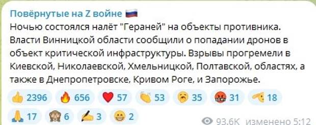 Ночью состоялся налёт "Гераней" на объекты противника. Власти Винницкой области сообщили о попадании дронов в объект критической инфраструктуры. Взрывы прогремели в Киевской, Николаевской, Хмельницкой, Полтавской областях, а также в Днепропетровске, Кривом Роге и Запорожье,