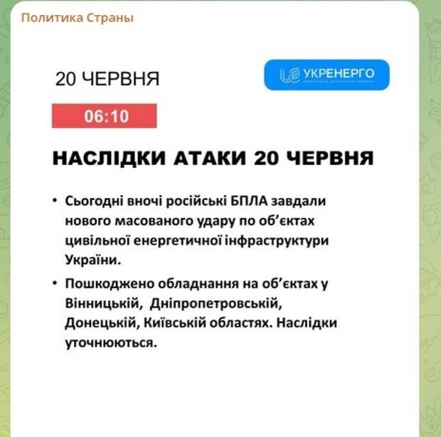 По данным Укрэнерго, в ночь на 20 июня русские дроны атаковали объекты энергетики в Киевской, Винницкой и Днепропетровской областях. Сообщается, что в результате налёта повреждено оборудование, а также есть разрушения. В воздушных силах Украины уточняют, что якобы сбили пять ракет из девяти, а три "Искандера" и одна авиаракета "нашли свои цели".