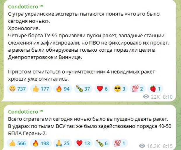 По его данным, ночью четыре борта Ту-95 произвели пуски ракет, после чего "западные станции слежения их зафиксировали, но ПВО не фиксировало их пролёт, а ракеты были обнаружены только когда поразили цели в Днепропетровске и Виннице". Автор канала отмечает, что при этом "об "уничтожении" 4 невидимых ракет" на Украине уже успели отчитаться.