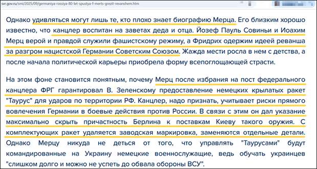 В СВР считают, что управлять "Таурусами" будут немецкие военные, командированные на Украину. Мол, обучать украинцев слишком долго, а времени, судя по всему, у Киева мало. Да и разведданные нужны для применения таких ракет — США, Германия, Швеция, Франция и Великобритания активно делятся информацией, чтобы эти системы могли работать. И удивляться такой ретивости со стороны Мерца, считают аналитики внешней разведки, не стоит: нынешний канцлер, по заветам своих дедов-нацистов, служивших Гитлеру, пытается взять реванш за поражение Третьего рейха.