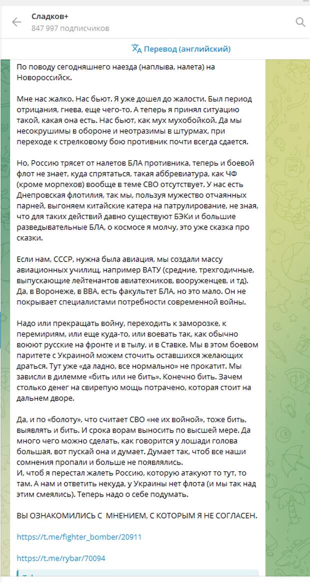 Атака противника по Керчи и Новороссийску многих заставила высказать неприятную правду. Не остался в стороне и военкор Александр Сладков. В своём телеграм-канале он написал: "Надо или прекращать войну, или воевать так, как обычно воюют русские". Впрочем, позже добавил ещё много интересного…