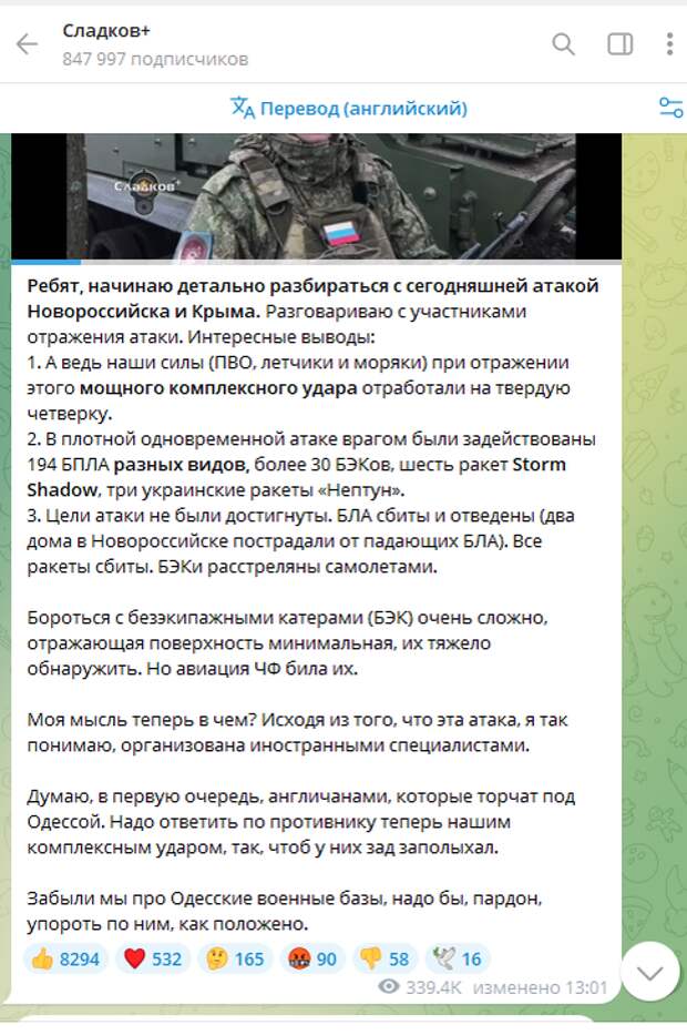 Бороться с безэкипажными катерами (БЭК) очень сложно, отражающая поверхность минимальная, их тяжело обнаружить. Но авиация ЧФ била их. Моя мысль теперь в чём? Исходя из того, что эта атака, я так понимаю, организована иностранными специалистами. Думаю, в первую очередь англичанами, которые торчат под Одессой. Надо ответить по противнику теперь нашим комплексным ударом, так, чтоб у них зад заполыхал. Забыли мы про одесские военные базы, надо бы, пардон, упороть по ним, как положено.