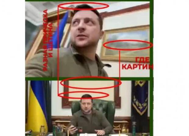 "Вначале президент записывает видео на телефон, затем идёт монтажная склейка и переход на ТВ-камеру, здесь и начинаются странности. Обратите внимание на картину за спиной, она пропадает при смене ракурса. У Зеленского немного другая прическа и разная длина щетины на лице. Очевидно, что первая часть видео была записана заранее, возможно, перед отъездом из Киева специально для таких целей", — написала телеведущая в своём Telegram-канале.