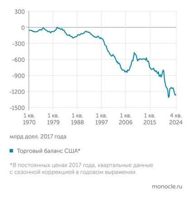 Причина беспокоиться у него действительно есть. Дефицит торгового баланса США в 2024 году составил 1,2 трлн долларов. Причем, даже если учесть не только товары, но и услуги, по которым баланс в пользу США, все еще останется дефицит в 0,9 трлн долларов.