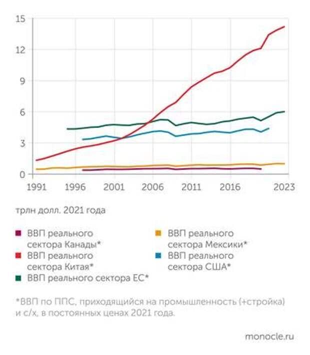 Почему же Трамп с таким нахрапом взялся за проблему торгового дефицита именно сейчас? Проблема в сопутствующей финансиализации экономики США (неудобное слово, которое означает неудержимое падение реального сектора в экономике за счет роста финансового сектора). Лучше всего это можно увидеть на графике ВВП реального сектора в реальном же выражении. ВВП США (по ППС в постоянных ценах 2021 года), приходящийся на промышленность (включая строительство) и сельское хозяйство, с 1997 по 2021 год вырос в реальном выражении всего на 32%, то есть прирастал всего на 1,2% в год, тогда как весь ВВП за этот же период в реальном выражении в среднем рос со скоростью 2,5%. При этом аналогичный показатель для Китая вырос более чем в четыре (!) раза (см. график 4).