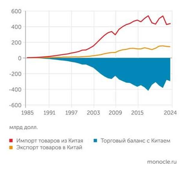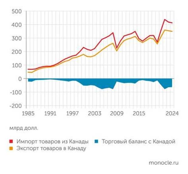 Трампу, наверное, было бы проще, если бы основная часть торгового дефицита США приходилась на Китай, но в реальности, по данным Бюро переписи США, в 2024 году на него приходится всего 24,6%. А дальше в списке основных торговых партеров США уже идут «друзья» — ЕС (19,6%), Мексика (14,3%) и Канада, которая хотя и занимает первое или второе место среди торговых партнеров США, но на нее приходится всего 5,3% торгового дефицита. Так что не очень понятно, за что вообще досталось Канаде с экономической точки зрения. Конечно, если бить по всей четверке, то какой-то результат точно будет — суммарно на них приходится 63,7% торгового дефицита.