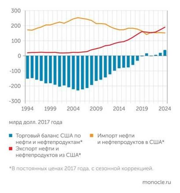 США упорно работают над ее «лечением»: важным шагом стало то, что к 2020 году они решили одну из своих давних проблем и из нетто-импортера превратилась в нетто-экспортера нефти и нефтепродуктов (см. график 3). В 2024 году США импортировали нефти и нефтепродуктов на 235,8 млрд долларов, а экспортировали на 280,7 млрд долларов, выйдя в плюс на 44,9 млрд долларов (33 млрд годом ранее). Для этого понадобились годы упорного труда: сланцевая революция, демпинг на рынке и исключение России и Ирана из мирового нефтяного рынка (исключение не удалось, но свою долю на нефтяном рынке США выгрызли).