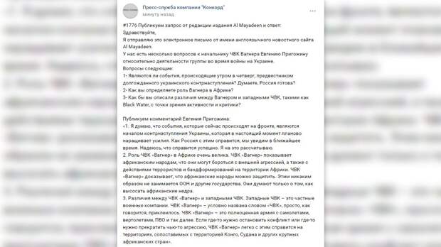 prt scr vk.com | Пресс-служба компании «Конкорд»Пригожин добавил, что если нужно остановить конфликт или где-то нужно прекратить чью-то агрессию, именно ЧВК «Вагнер» легко с этим справится на территориях, сопоставимых с территорией Конго, Судана и других крупных странах африканского континента.
