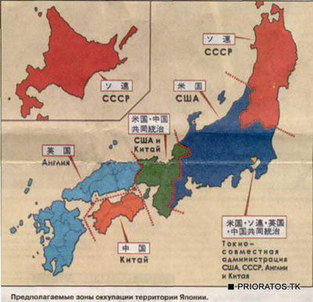 На самом деле, предложенный американским президентом Франклином Делано Рузвельтом план возможного послевоенного раздела Японии на начало 1945-го вполне уже существовал. Япония делилась между четырьмя главными державами-участницами войны на Дальнем Востоке: СССР, США, Великобританией и даже Китаем.
